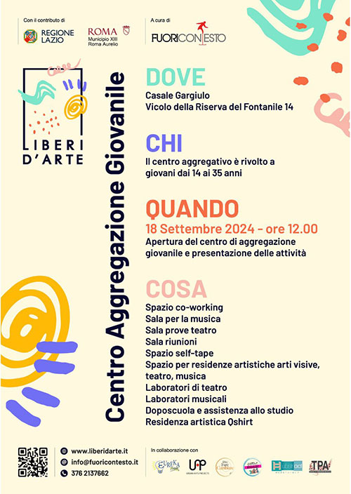 Mercoledì 18 settembre alle ore 12,00 si aprono le porte del Centro Aggregazione Giovanile "Liberi D’Arte", al Casale Gargiulo, Vicolo della Riserva del Fontanile, 14.