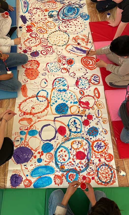 Ispirandosi al libro “La fabbrica dei colori di Hervè Tullet”, ogni bambin* ha scelto il suo fiore e insieme hanno creato il comune prato fiorito.